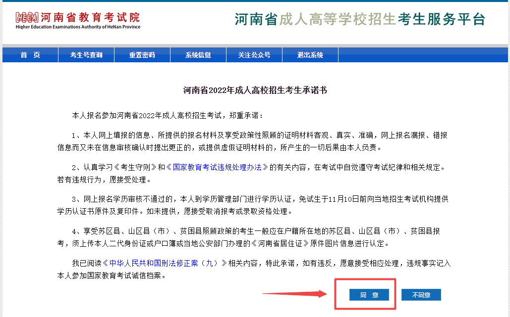 1、考生访问“河南省招生办公室网站(http://www.heao.gov.cn),登录“河南省成人高校招生考生服务平台”了解我省疫情防控要求和成人高校招生政策和规定,阅读签订《河南省2022年成人高校招生考生承诺书》后进入网上报名阶段。