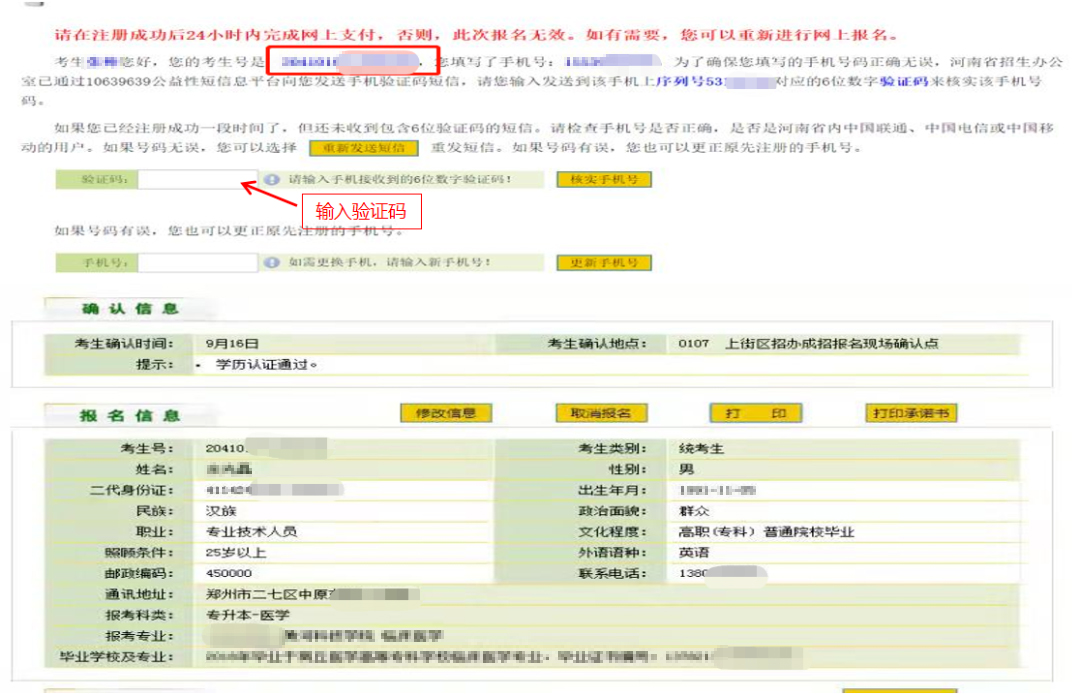 5、输入验证码并核对信息,考生信息审核通过后方可缴费。