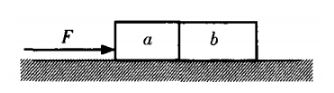 [单选题]如图所示,质量均为m的物体a和,置于水平支撑面上,它们与支撑面间的动摩擦因数均为μ,a、b间为光滑接触,在水平力F作用下,它们一起沿水平面匀速运动,若a、b间的作用力为N,则N的大小应为( )