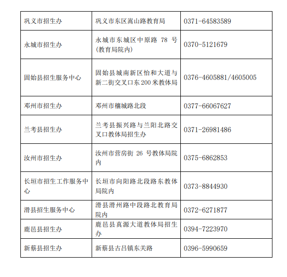 附:河南省2022年全国成人高校招生考试各地教育招生考试机构咨询电话(下载查看)